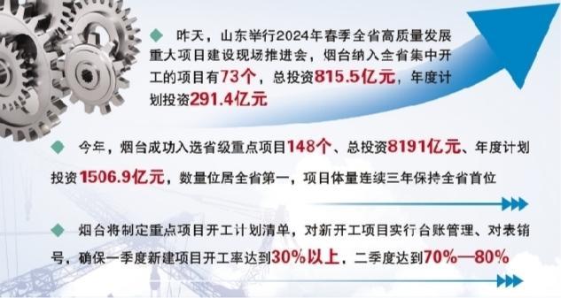 2月26日,山东省举行2024年春季全省高质量发展重大项目建设现场推进会,1007个重大项目集中开工建设。烟台市纳入全省集中开工的项目有73个,总投资815.5亿元,年度计划投资291.4亿元。其中,2024年省级重点项目21个,总投资425.8亿元,年度计划投资145.4亿元;市级重点项目35个,总投资316.6亿元,年度计划投资117.3亿元。