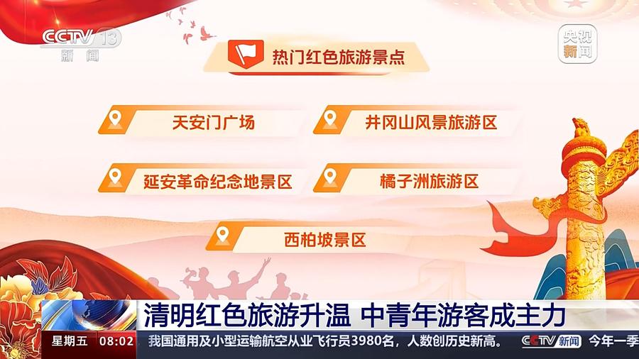 数据显示,从清明假期前一周开始,红色旅游就呈现上升趋势,游客规模在4月4日达到峰值,清明节当天游客量比节前日均增长37%,同比增长10%。