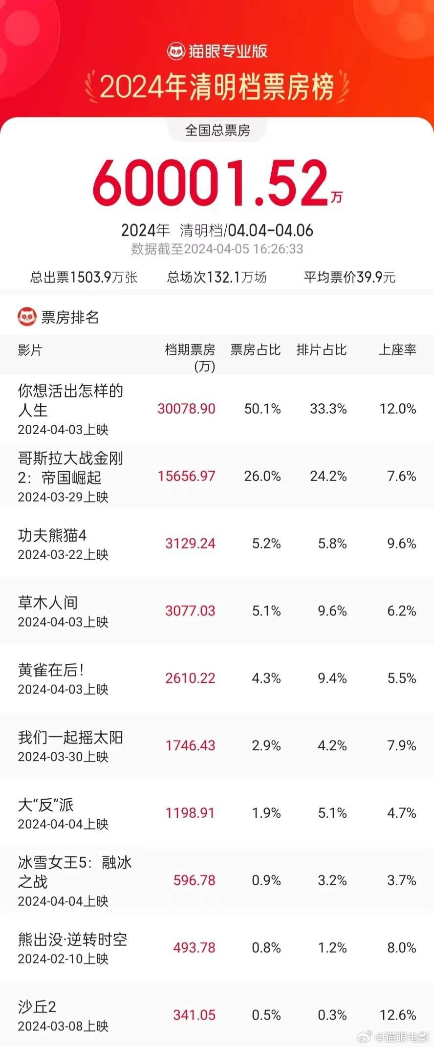 据猫眼专业版数据,2024年4月5日16时26分,2024年清明档(4月4日-4月6日)总票房破6亿!《你想活出怎样的人生》《哥斯拉大战金刚2:帝国崛起》《功夫熊猫4》分列清明档票房榜前三。