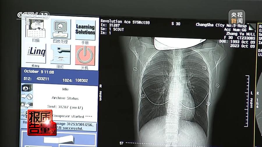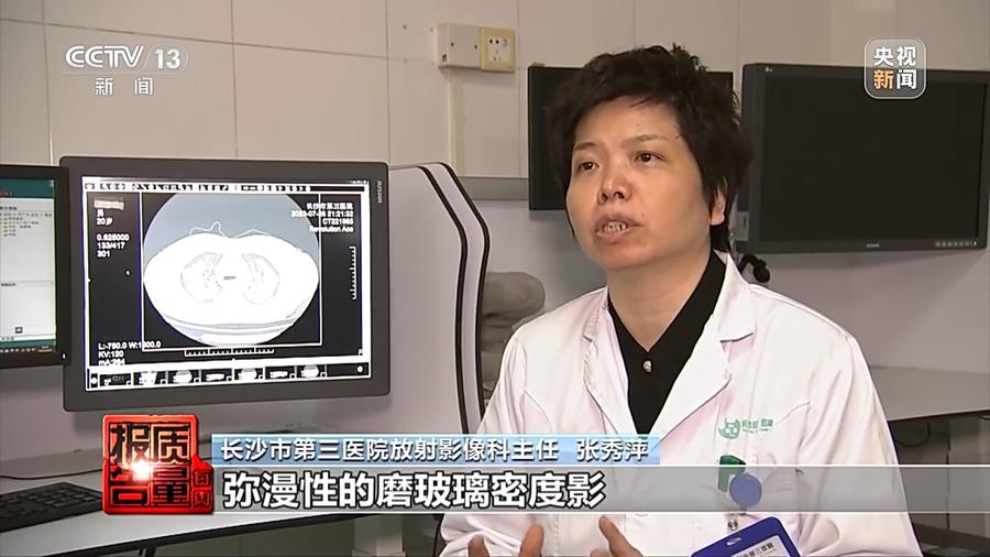 长沙市第三医院放射影像科主任 张秀萍:他就是双肺出现对称性、弥漫性的磨玻璃密度影,可以看到他肺部的肺疮,双肺出现对称性的密度增高影,这白色的一大片,从上肺到下肺就都有。
