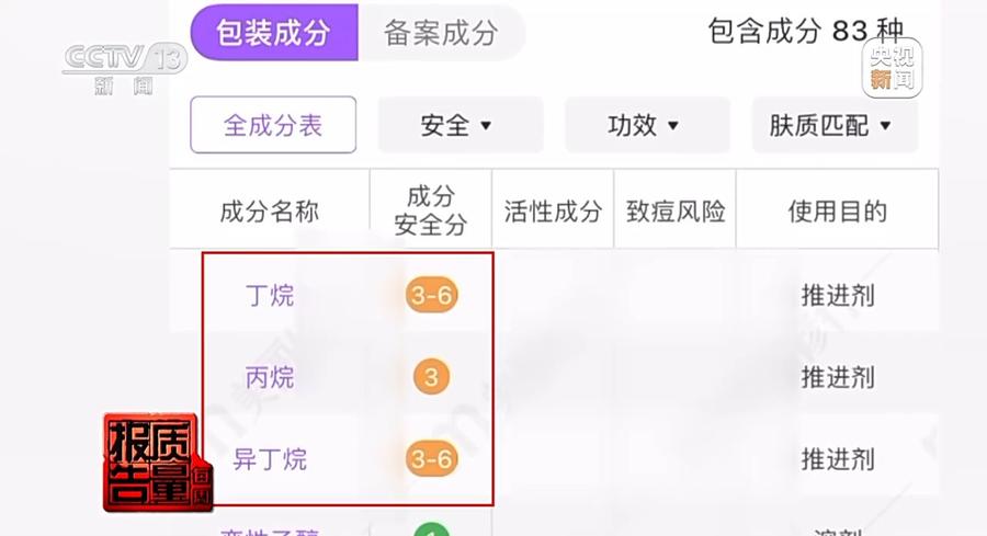 收到产品,打开包装记者看到,几乎所有的产品包装上都印着几十种之多的产品成分,作为消费者根本无从知道这些专有名词代表什么。记者也只能借助专业的成分分析软件进行查询。在分析软件上显示,7款产品中大部分成分都是些保湿、抗氧化的皮肤调理剂和化学防晒剂,除此以外,七款产品中还含有标称为丁烷、丙烷、异丁烷的成分,它们在成分分析软件上被统称为推进剂。