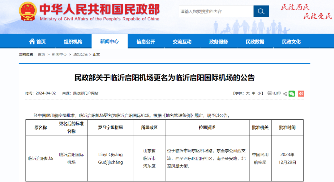 4月2日,民政部官网公布了多个机场更名消息。其中,经中国民用航空局批准,临沂启阳机场更名为临沂启阳国际机场。
