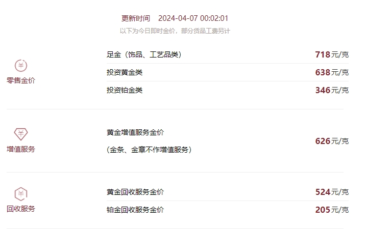 4月7日,周生生的足金饰品零售挂牌价格已经飙升到719元/克。周大福、潮宏基分别为718元/克、718元/克,相较于3日的703元/克,均上涨了15元。