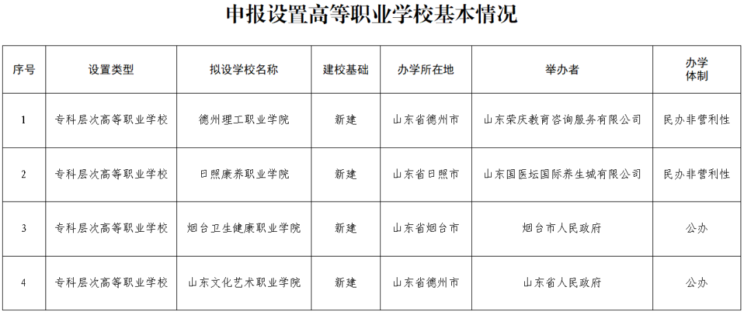 今日,省教育厅网站发布《关于申报设置高等职业学校的公示》,共4所高等职业学校申报设置,分别是德州理工职业学院、日照康养职业学院、烟台卫生健康职业学院、山东文化艺术职业学院,设置类型均为专科层次高等职业学校,均为新建。公示期为2024年4月7日至2024年4月11日。