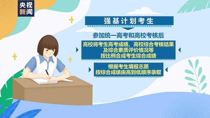 据介绍,强基计划一般每年4月中上旬启动。考生参加统一高考和高校考核后,高校将考生高考成绩、高校综合考核结果及综合素质评价情况等按比例合成考生综合成绩,根据考生填报志愿,按综合成绩由高到低顺序录取。特别提醒考生的是,体质测试是强基计划高校必测项目。
