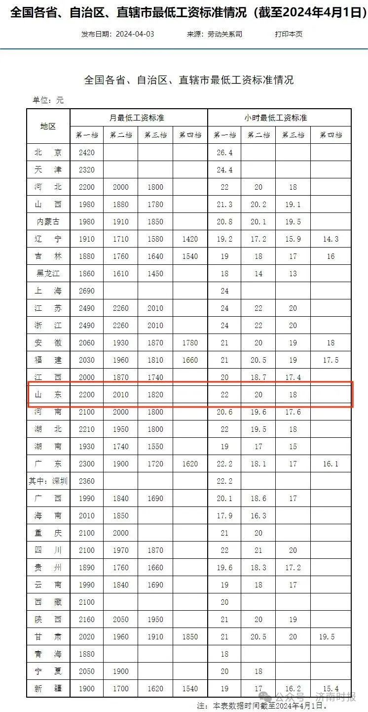 山东省第一档月最低工资标准为2200元,第一档小时最低工资标准为22元。