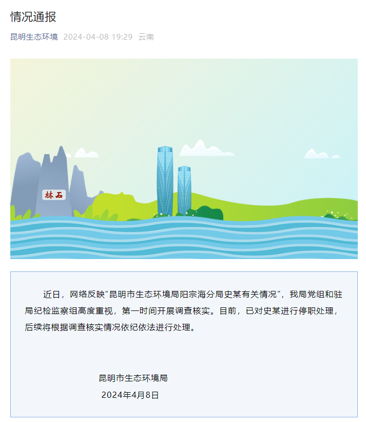 近日,网络反映“昆明市生态环境局阳宗海分局史某有关情况”,我局党组和驻局纪检监察组高度重视,第一时间开展调查核实。目前,已对史某进行停职处理,后续将根据调查核实情况依纪依法进行处理。