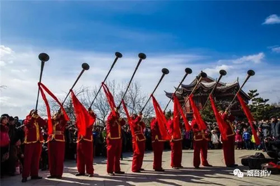 祭祀类的乐曲主要用于官吏的出巡、军队的检阅、各种庆典以及民间的婚丧嫁娶等活动。一般具有节奏舒缓凝重,音调庄严肃穆,以同音重复和大挑等手法构成,具有气势恢弘、威武豪迈等特点。再结合流传在蓬莱的大鼓、大锣、大铙等打击乐,就更具有威严雄壮、大气磅礴的气氛。