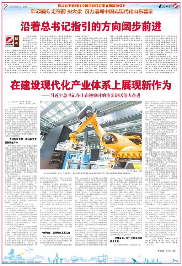 “山东在推进科技创新与产业创新深度融合、发展新质生产力、完善现代化产业体系上大有可为”“要着眼国家战略需求,统筹推进传统产业改造提升、新兴产业培育壮大、未来产业超前布局”“要大力推动发展方式绿色低碳转型,推进绿色环保科技创新和产业发展”……5月22日至24日,习近平总书记深入日照、济南等地进行调研,听取山东省委、省政府工作情况汇报并发表重要讲话,对山东各项工作取得的成绩给予肯定,并为山东发展把舵定向。全省广大干部群众表示,要认真学习贯彻落实习近平总书记重要讲话重要指示精神,大力发展新质生产力,强化科技创新和产业创新深度融合,加快推进绿色低碳转型。