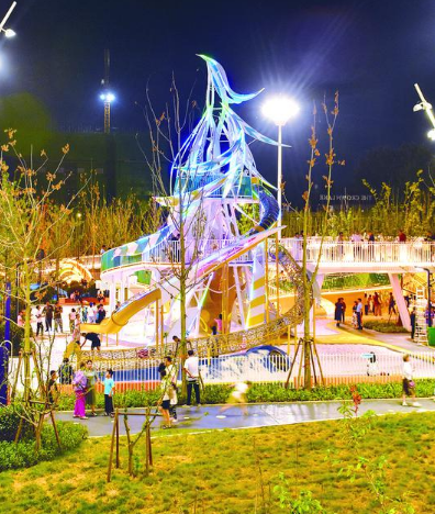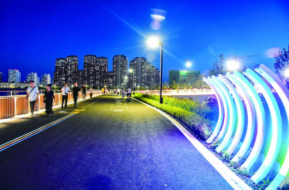 晚霞映湖畔,城市美如画。傍晚时分,在位于莱山区的凤凰湖公园内,灯光璀璨,美不胜收,前来游玩的市民络绎不绝。这个集儿 童娱乐、活力运动、老年休闲、综合服务、堤坝综合防护和全龄运动服务等多功能于一体的“全龄友好公园”,极大地丰富了市民夜间娱 乐的体验感,成为市民夜间休闲的好去处、夜间生活的新选择。