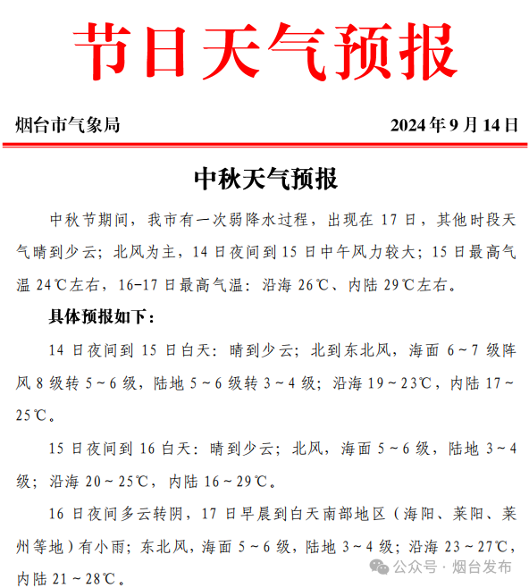中秋节期间,我市有一次弱降水过程,出现在17日,其他时段天气晴到少云;北风为主,14日夜间到15日中午风力较大;15日最高气温24℃左右,16-17日最高气温:沿海26℃、内陆29℃左右。