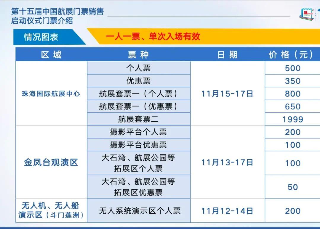 门票均采取限额销售的方式进行售票。三地限额分别为:珠海国际航展中心每天限量8万张(11月15日—17日)、金凤台观演区每天限量2万张(11月13日—17日)、中国航展无人机无人船演示区(斗门莲洲)每天限量1.5万张(11月12日—14日)。