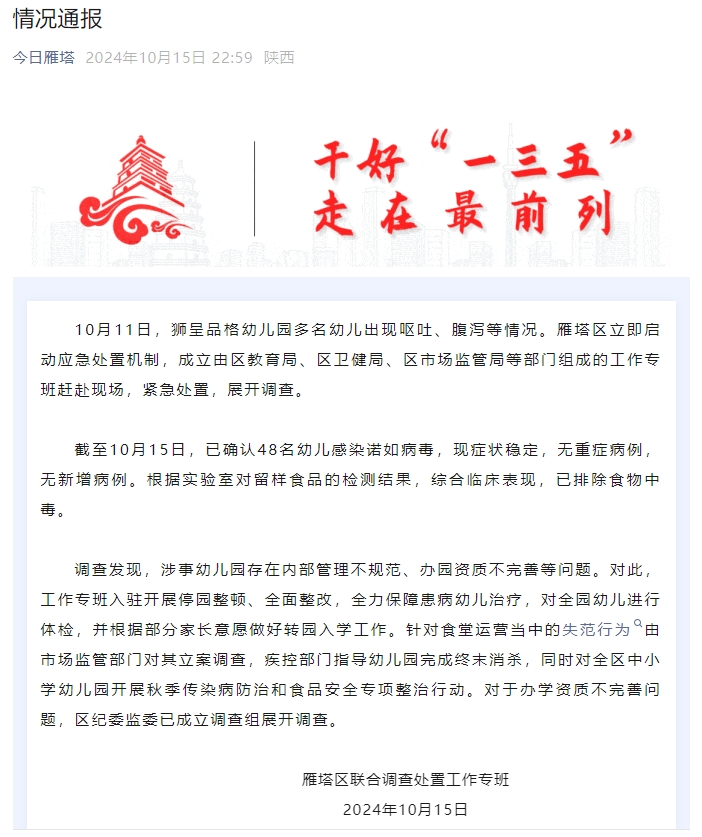 近期,西安市雁塔区狮呈品格幼儿园发生了一起令人揪心的事件,48名幼儿感染诺如病毒,根据“今日雁塔”消息,已排除食物中毒,调查发现,涉事幼儿园存在内部管理不规范、办园资质不完善等问题。
