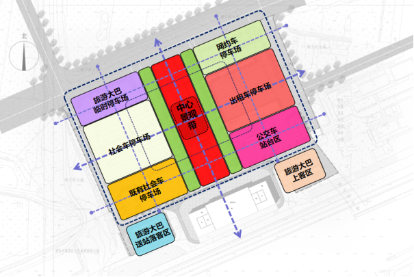 六区:旅客集散区;绿化景观休息区;即停即走送站区;出租车、网约车接站区;社会停车、大巴停车区;公交车辆送、接站区。