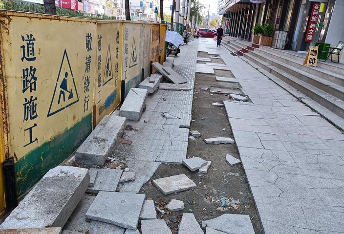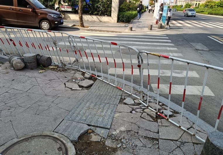 14日,记者现场看到,芝罘区北马路南侧、桃花街北首以东数十米人行道被挖开,裸露出大面积泥土,破碎的人行道板堆在路边,路口隔离墩也被挖出,散落在地面上。市民通行此处时,要么小心翼翼绕开破损路面,要么冒险走上机动车道。“从今年6月份开始,这段人行道就被挖成这样了,到现在已经有4个月了,一直没有修复。”市民李先生告诉记者,“这段人行道旁边是大型居民区——华茂社区,周围还有口腔医院、幼儿园、多个写字楼,每天通行这里的市民很多,人行道支离破碎,给行人带来很大不便和安全隐患。”