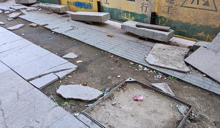 什么原因造成市民行路难?华茂社区多位楼长告诉记者:“华茂社区正在进行老旧小区改造,这段人行道下面,有污水管道需要重新布设,施工单位开挖人行道时,被烟台市市政养护中心制止。因为双方发生纠纷,导致污水管道工程没有继续进行,破损的人行道路面一直也没能修复。”