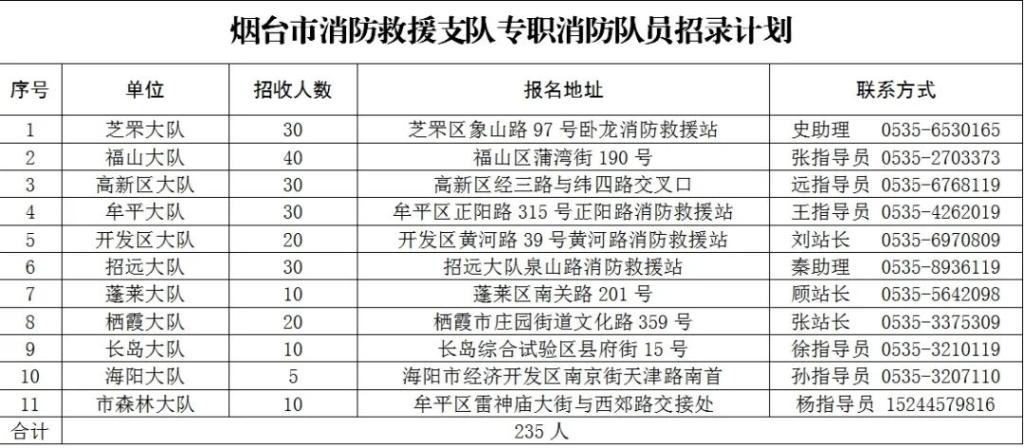 (四)烟台市消防救援支队不收取任何报名费用(个人入职前体检需自费),不接受任何人力资源公司、中介代理形式开展专职消防员招收报名,如遇此类情况请直接拨打110报警。报名人员请直接到上述指定地点报名,如有疑问请致电详细咨询。