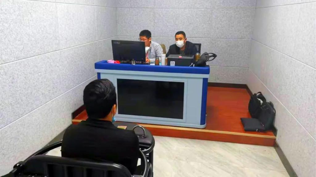 图为专案组民警正在对犯罪嫌疑人进行审讯
