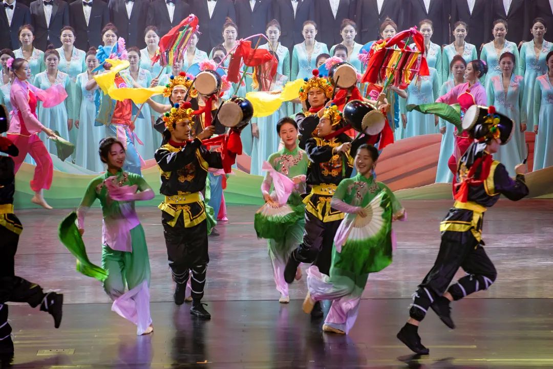 舞蹈《大秧歌扭起来》展现了“海阳秧歌”这一国家非物质文化遗产,在“嘟噜儿隆冬咙咚呛”的节奏和喝彩声中舞蹈演员们深入到台下观众席中和大家一起互动,现场洋溢起热闹非凡的气氛。