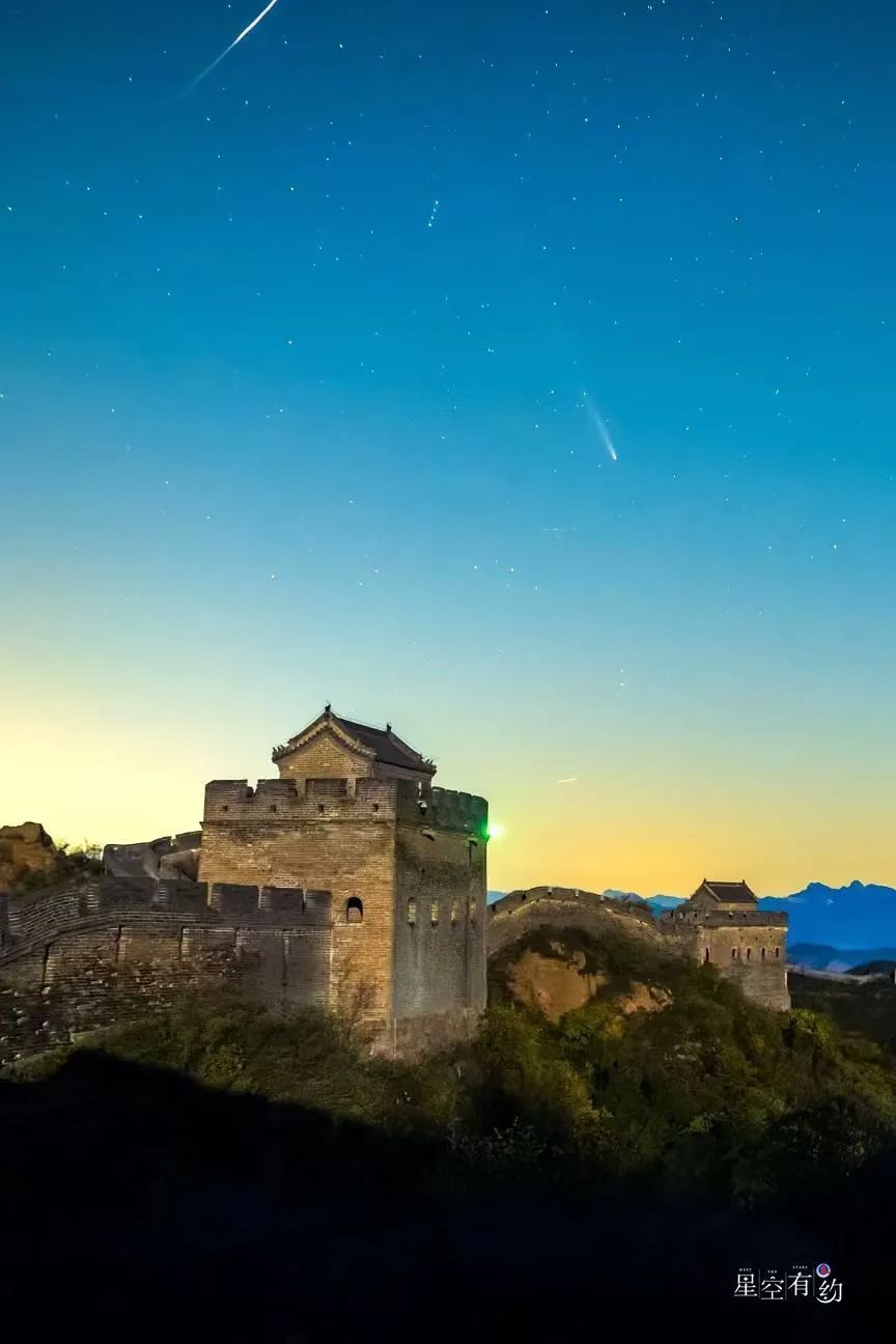 10月19日在河北金山岭长城拍摄的紫金山-阿特拉斯彗星与流星同框。(孙思摄,星联CSVA供图)