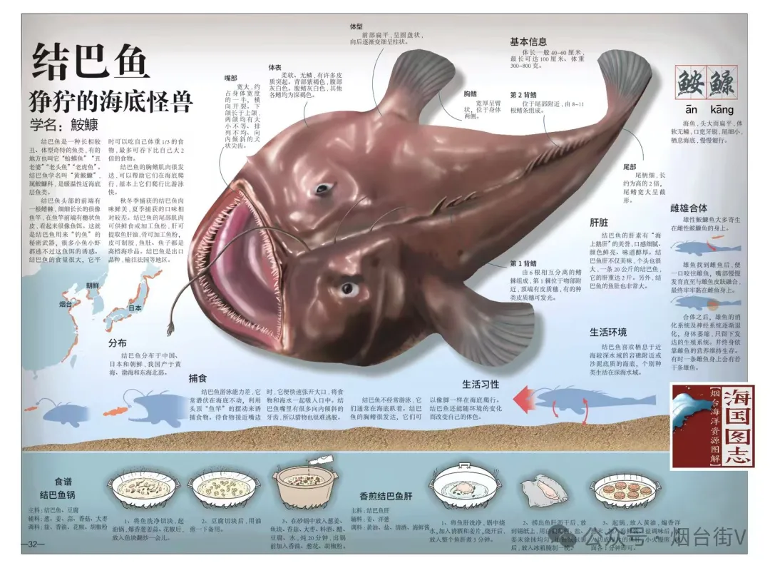 鮟鱇鱼通常底栖海中,喜静伏且活动缓慢。它的胃口超大,身躯向后细尖成柱形。一对小眼睛嵌在头顶上,一张颇有夸张意味的大嘴长得像身体一样宽,嘴巴边缘长着两排尖端向内的利齿。它骨脆无鳞,通体软塌,背色深褐,腹部灰白,头部大得有些不可思议。凭着这样一副吓人的相貌赢得“蛤蟆鱼”的惯称,鮟鱇鱼也算是“实至名归”了。