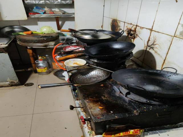 上榜理由:厨房油污严重,案板、油烟机等设施设备油污灰尘较多;生活用品与加工操作用品混放;垃圾桶无盖;未留存采购票据。