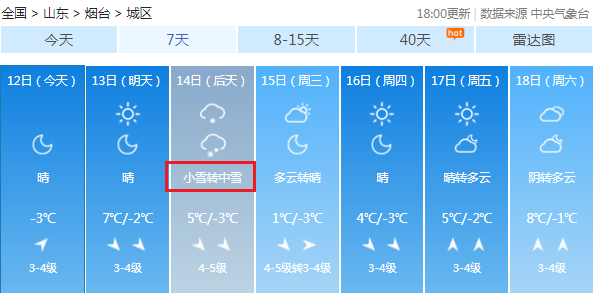 烟台市区:13日白天,晴间多云,西南风转西北风3~4级,最低气温-3℃,最高气温7℃。