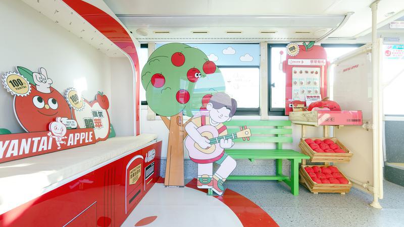 烟台融媒1月14日讯(记者 信召红 通讯员 郭健 唐楠楠 孙俊杰 摄影报道)日前,记者走进烟台市公交集团高新区有限公司,立刻被大楼门口停靠的嗨心巴士“烟台苹果号”吸引住了目光。巴士外观色彩艳丽,颜值颇高。车厢一层精心布置了打卡拍照区,苹果卡通形象、“苹”步青云、“苹”安喜乐等流行元素琳琅满目,令人眼前一亮。与普通公交车不同,苹果号巴士还增设了保险柜、冰箱、吧台桌椅等设施设备,沿途在网红景点停靠期间售卖文创雪糕、文创产品以及烟台本地特色零食、饮料,丰富了市民游客的乘车体验。