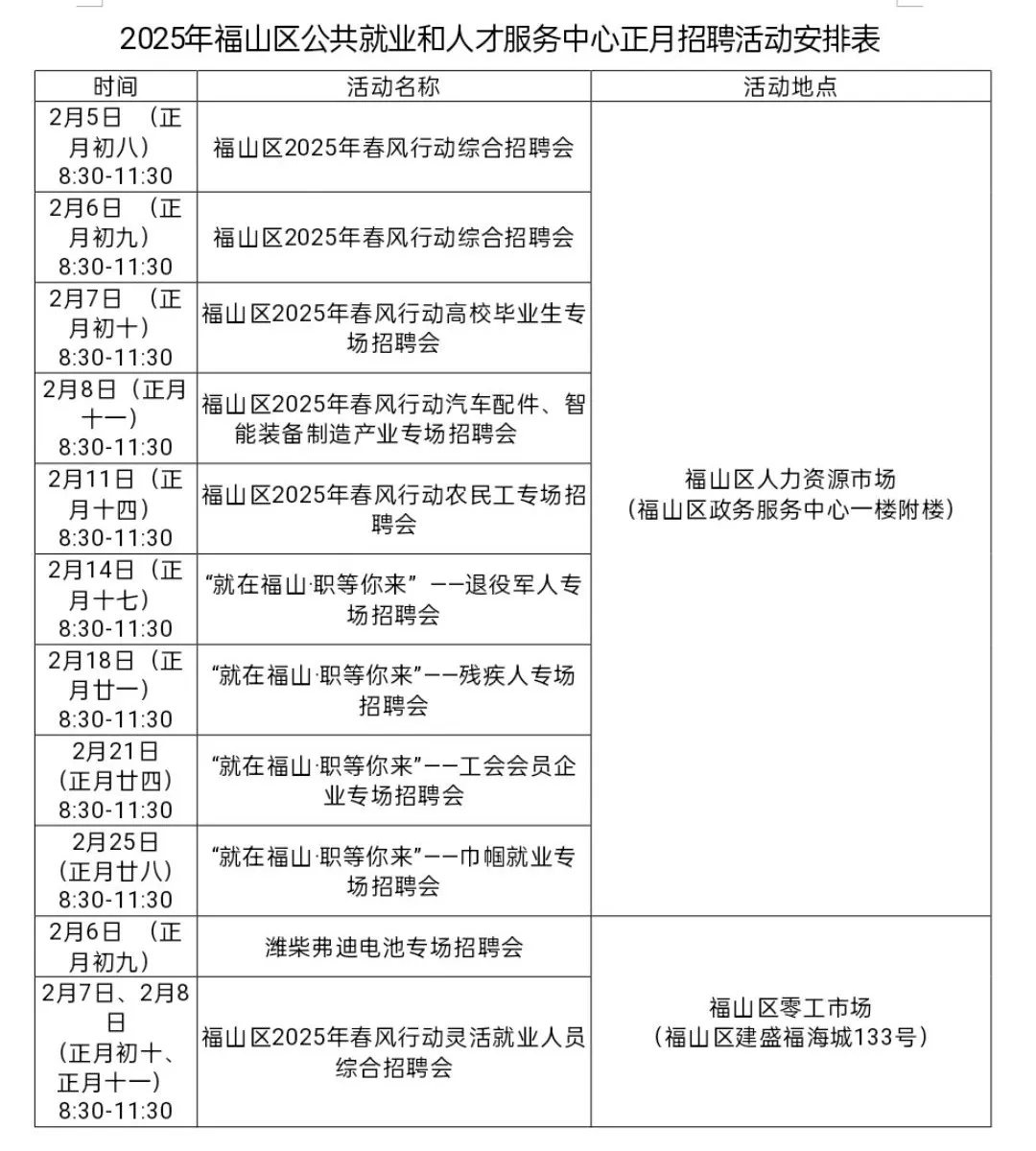 2月5日(正月初八)至2月8日(正月十一),福山区人力资源市场和零工市场将连续四天举办2025年“春风行动”系列招聘会,正月期间每周至少2场招聘会,累计将举办12场招聘会。