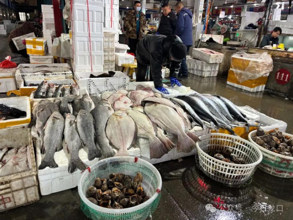 鲅鱼、带鱼、北极虾、白虾、鳎目鱼、海螺……凌晨的海鲜市场让人大开眼界,鱼虾蟹品种丰富、数量大,采购、进货的商贩、市民络绎不绝。一辆辆厢式货车车门敞开,一盒盒冷冻的海鲜整齐码放,伴着淡淡月色,买卖吆喝声此起彼伏。