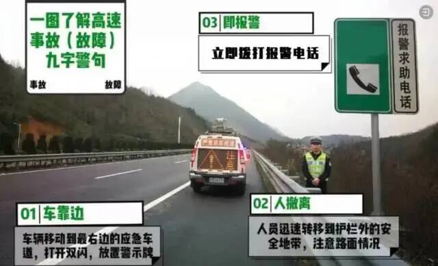牢记“车靠边、人撤离、即报警”口诀,一旦在高速上发生事故等情况导致车辆无法正常行驶的,请将车辆停到应急车道内,打开双闪并将三角牌摆放至车辆后方150米外,人员立即撤离至护栏外并报警。