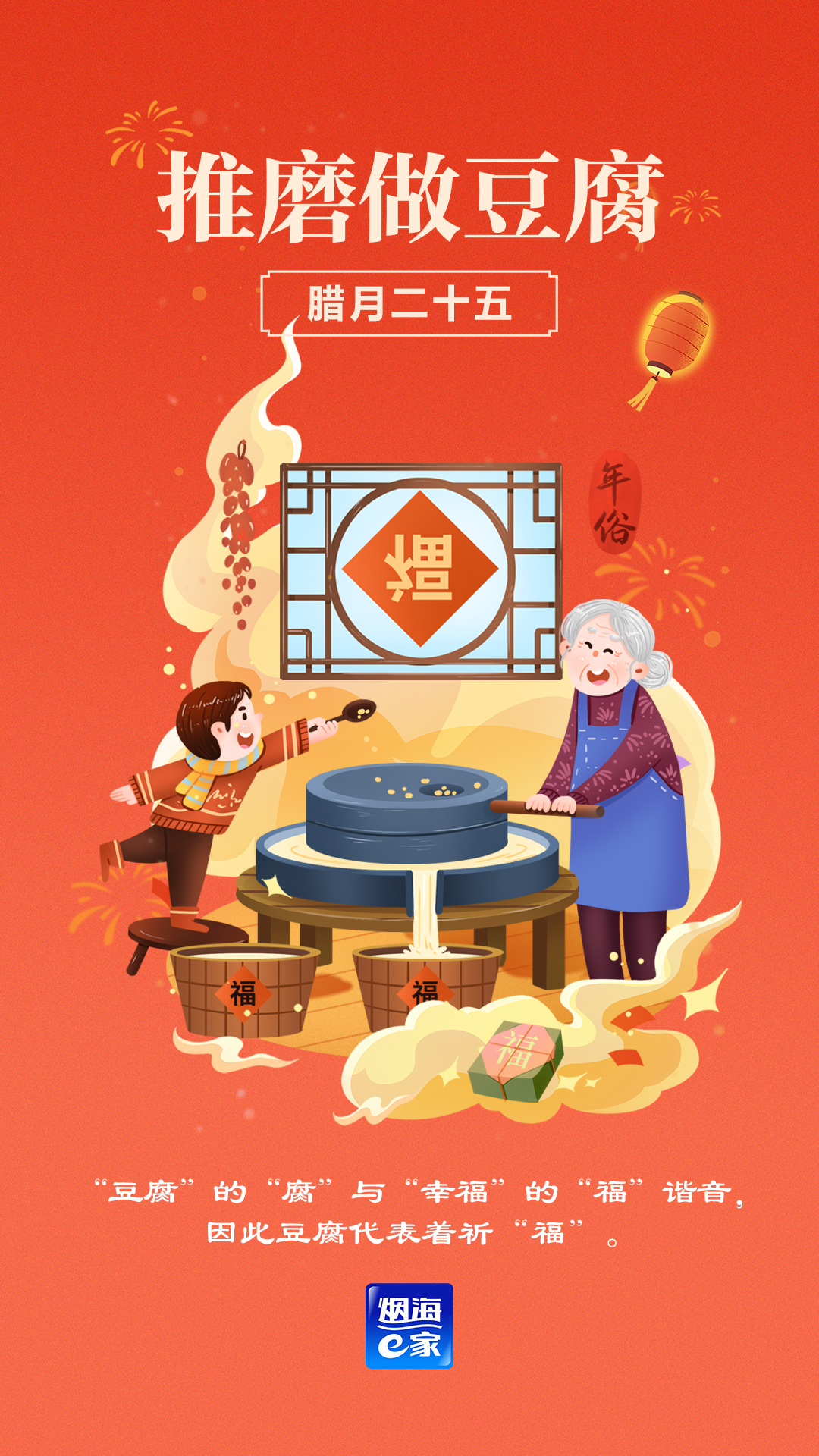 民谚称“腊月二十五,推磨做豆腐”。这一天,家家户户都会忙碌起来制作豆腐。因为豆腐的“腐”与幸福的“福”谐音,被人们寄予了新年“富贵”的希望。而且在古代,豆腐是一种便于保存和运输的食品,适合作为春节期间的储备食物。一些地方还有在除夕以前吃豆腐渣的习俗,传说灶王上天汇报后,玉帝会下界查访,各家各户吃豆腐渣以示清苦,瞒过玉皇的惩罚。