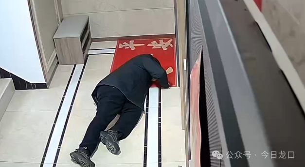 画面显示,家住对门的高大叔走出房门准备穿鞋下楼,穿好鞋后,却面朝房门,弓着身子,头部低垂,一只手插在裤兜里,另一只手扶着门,身体站立不稳,左右摇晃,看起来就像喝醉了酒。大约过了10分钟,高大叔突然歪倒在门前,侧身躺在地上,虽然还能微微动弹,但已无法起身。