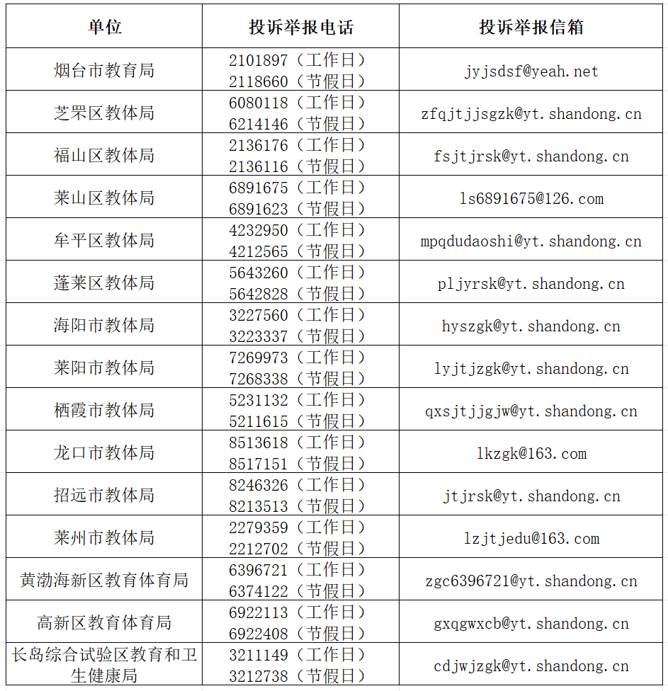 烟台融媒1月23日讯(记者 李京兰)为进一步加强师德师风建设,1月23日,烟台市教育局将烟台市中小学在职教师有偿补课投诉电话和电子信箱予以公开,接受社会监督。