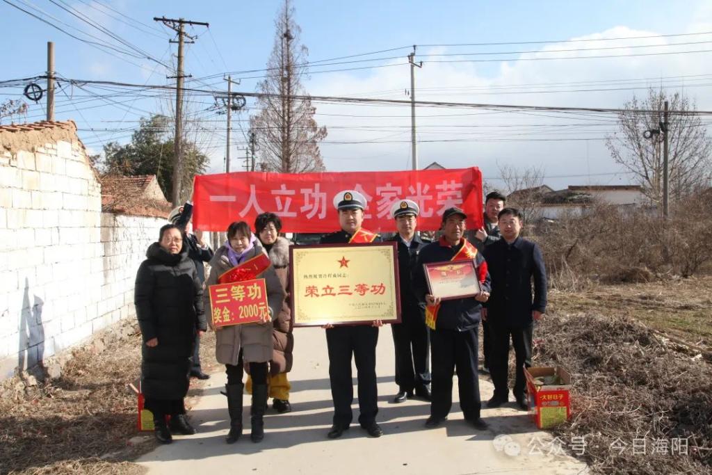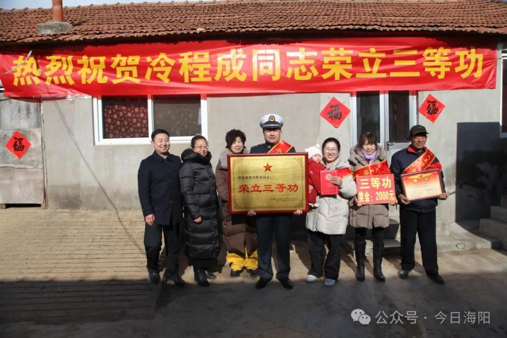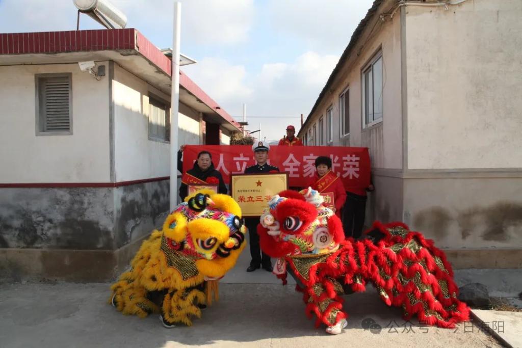 近日,在喜庆的锣鼓声和精彩的舞狮表演中,海军某部、市人武部、市退役军人事务局以及乡镇的工作人员将三等功立功喜报及2000元奖金,先后送到了行村镇行村新村现役军人王亚超、发城镇西下屋庄村现役军人冷程成家人手中,让这2个军人家庭倍增荣耀。