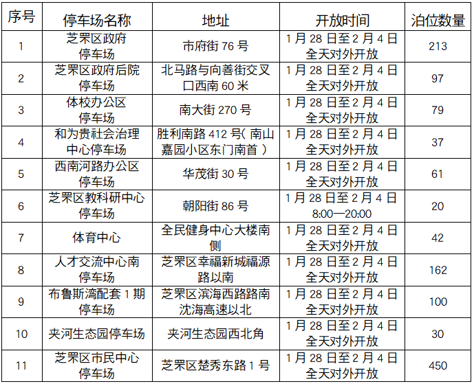 据统计,春节期间,芝罘区7处机关事业单位停车场、4处公共停车场,共1291个停车位免费开放,供市民临时停车。