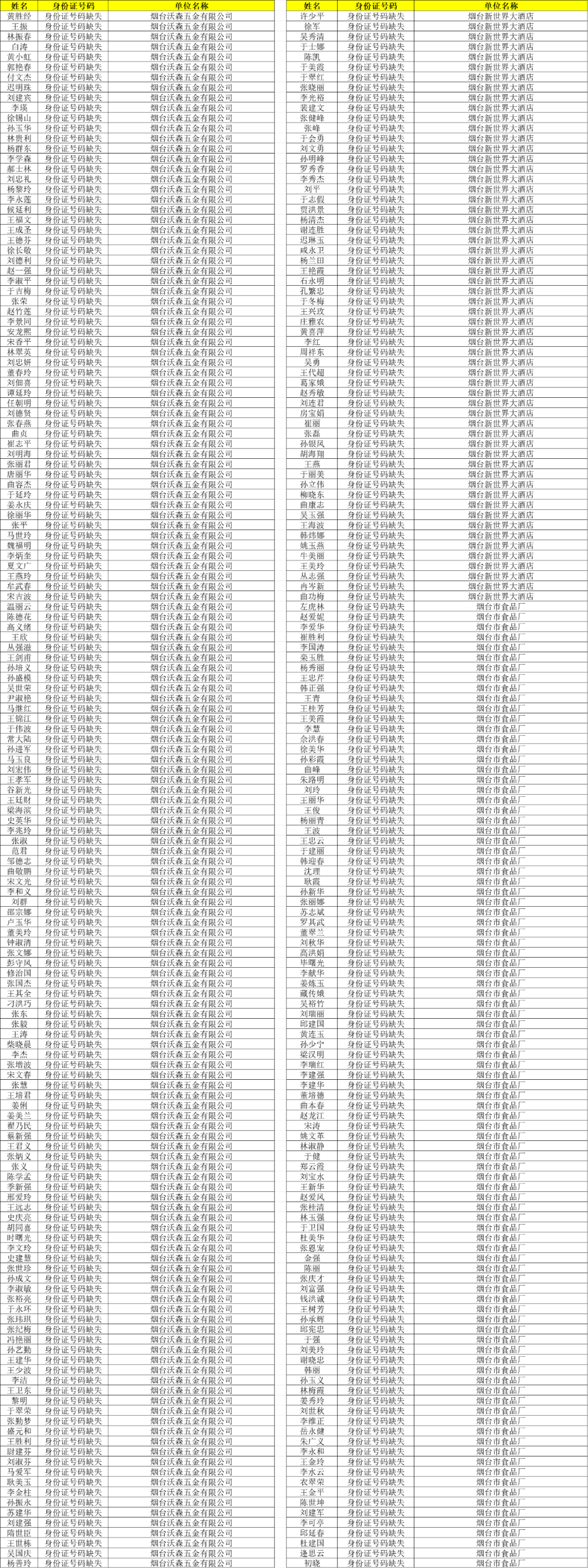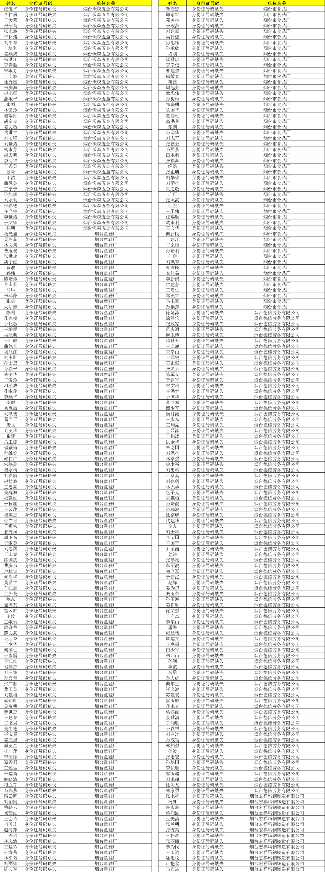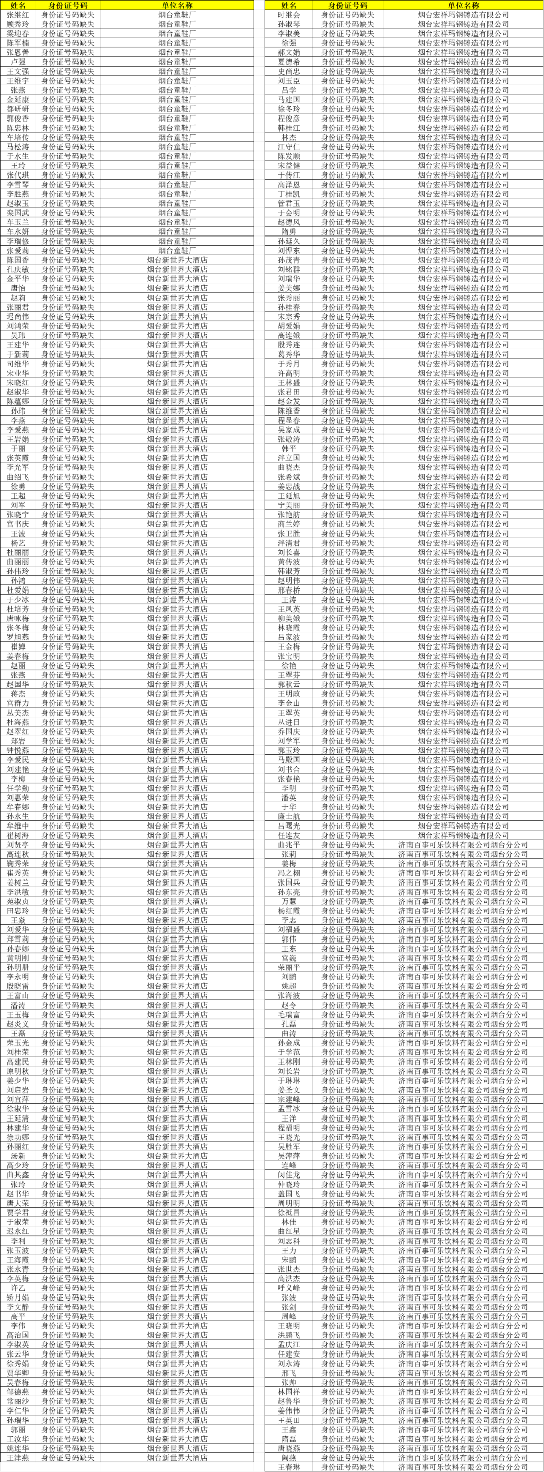 本批次名单为芝罘区缴存账户,涉及烟台沃森五金有限公司、烟台童鞋厂、烟台新世界大酒店、烟台市食品厂、烟台德信劳务有限公司、烟台宏祥玛钢铸造有限公司、济南百事可乐饮料有限公司烟台分公司共7家单位923名缴存职工。