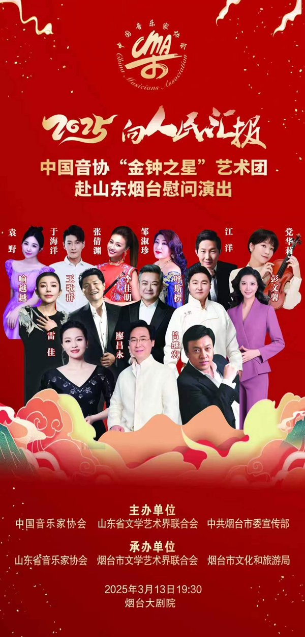 由中国音乐家协会、山东省文学艺术界联合会、中共烟台市委宣传部主办,山东省音乐家协会、烟台市文学艺术界联合会承办,烟台市音乐家协会执行的“向人民汇报”——中国音协“金钟之星”艺术团赴山东烟台慰问演出,将于3月13日19点30分在烟台大剧院举行。