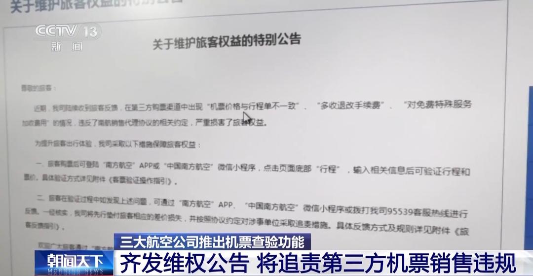 这两天,国航、东航、南航先后发布公告,针对第三方航空销售平台和代理人加价销售、篡改旅客行程等违规行为采取追责措施,并为旅客提供了机票验真和票价税费查询功能。这一举措能否有效解决机票市场存在的问题,保障消费者权益?