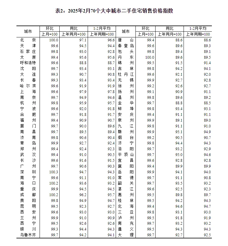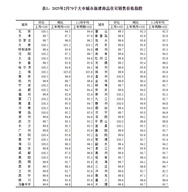 3月17日,国家统计局发布2025年2月份70个大中城市商品住宅销售价格变动情况,2025年2月份,从环比看,受春节销售淡季等因素影响,70个大中城市中,各线城市商品住宅销售价格总体稳中略降,其中一线城市新建商品住宅销售价格上涨。从同比看,各线城市商品住宅销售价格降幅均继续收窄。