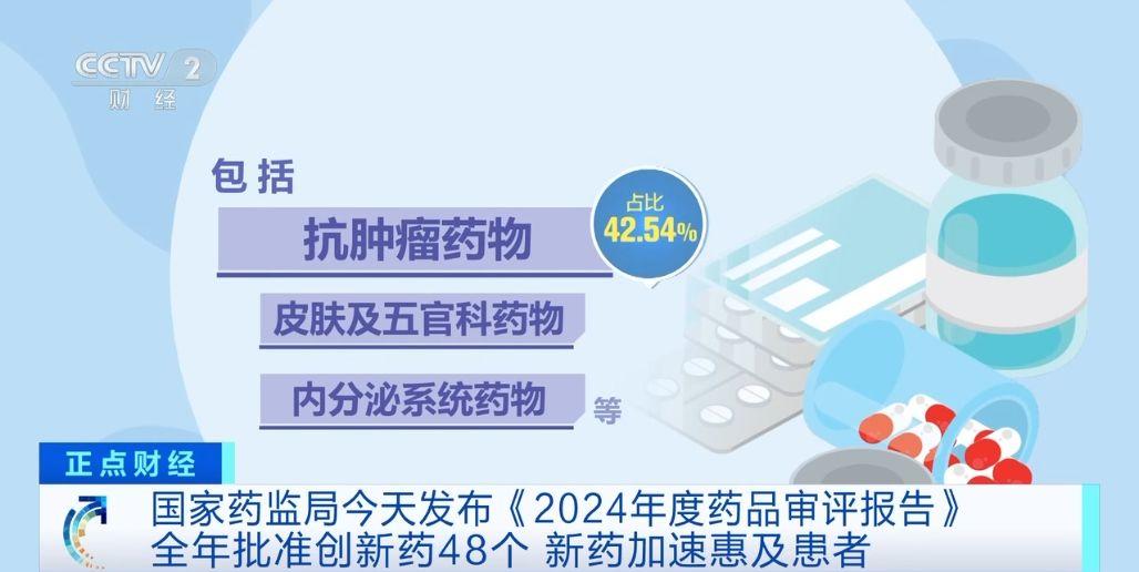 国家药监局18日发布《2024年度药品审评报告》。报告显示,2024年我国全年批准1类创新药48个,涵盖肿瘤、神经系统疾病和抗感染等近20个治疗领域,一大批新药好药加速惠及患者。