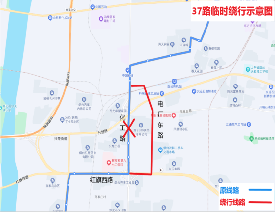 由西拓区场站发车,沿原线路运行至红旗西路与化工路交叉口直行,沿红旗西路、电厂东路运行至电厂东路与化工路交叉口右转恢复原线路。