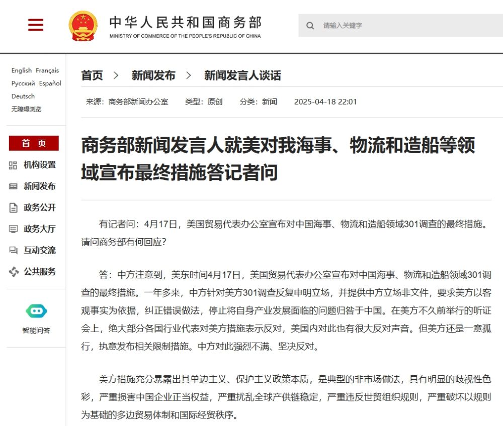 有记者问:4月17日,美国贸易代表办公室宣布对中国海事、物流和造船领域301调查的最终措施。请问商务部有何回应?