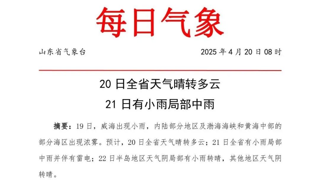 21日白天到夜间,全省天气多云转阴有小雨局部中雨并伴有雷电。东营、潍坊、日照和半岛地区南风转北风4~5级阵风6~7级,其他地区南风4级阵风 5~6 级转北风 4~5 级阵风 6~7 级,雷雨地区雷雨时阵风7~9级。