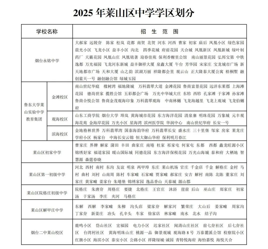 2025年,区教育体育局继续遵照适龄新生免试、划区、就近入学(就近入学指的是相对就近,不是指绝对地理位置的远近)的原则,根据适龄儿童人数和分布状况、学校布局、学校规模、交通情况等因素,确定2025年莱山区义务教育阶段学校的学区范围。随着学校布局进一步优化,区教育体育局将继续适时对全区义务教育阶段学校的学区范围进行必要调整,确保义务教育免试就近入学全覆盖。