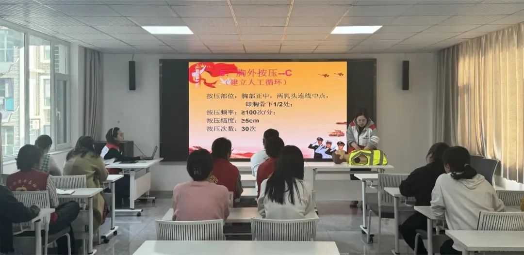 安泰社区组织开展应急救护专项培训。此次课程聚焦社区常见突发情况,通过“理论讲解+实操演练”相结合的方式,重点围绕心肺复苏(CPR)、气道异物梗阻急救(海姆立克法)等常见应急救护技能展开。社区红十字会志愿者以PPT的方式结合真实案例详细讲解急救流程、操作要点及注意事项,并利用人体模型进行心肺复苏实操练习,确保参训人员熟练掌握急救流程。