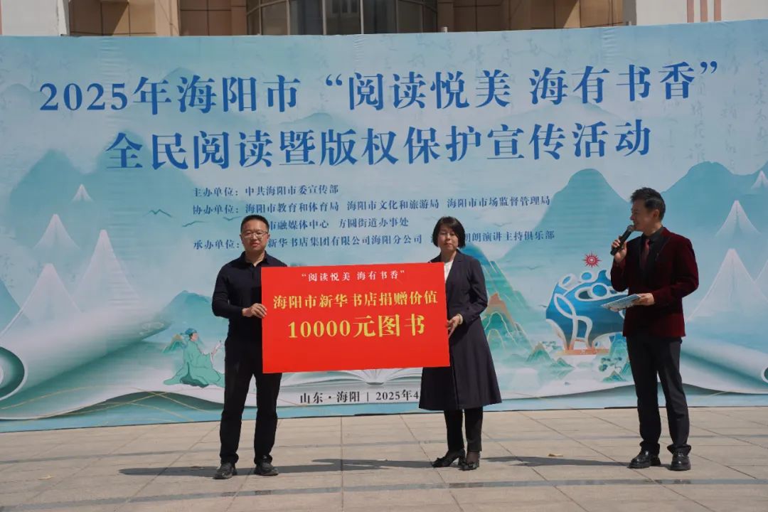 活动现场,市新华书店向市教体局进行图书捐赠,为教育事业助力书香。烟台十佳阅读推广人李雪峰宣读《海阳市2025年全民阅读倡议书》,号召全体市民积极参与阅读,让阅读成为生活的一部分。