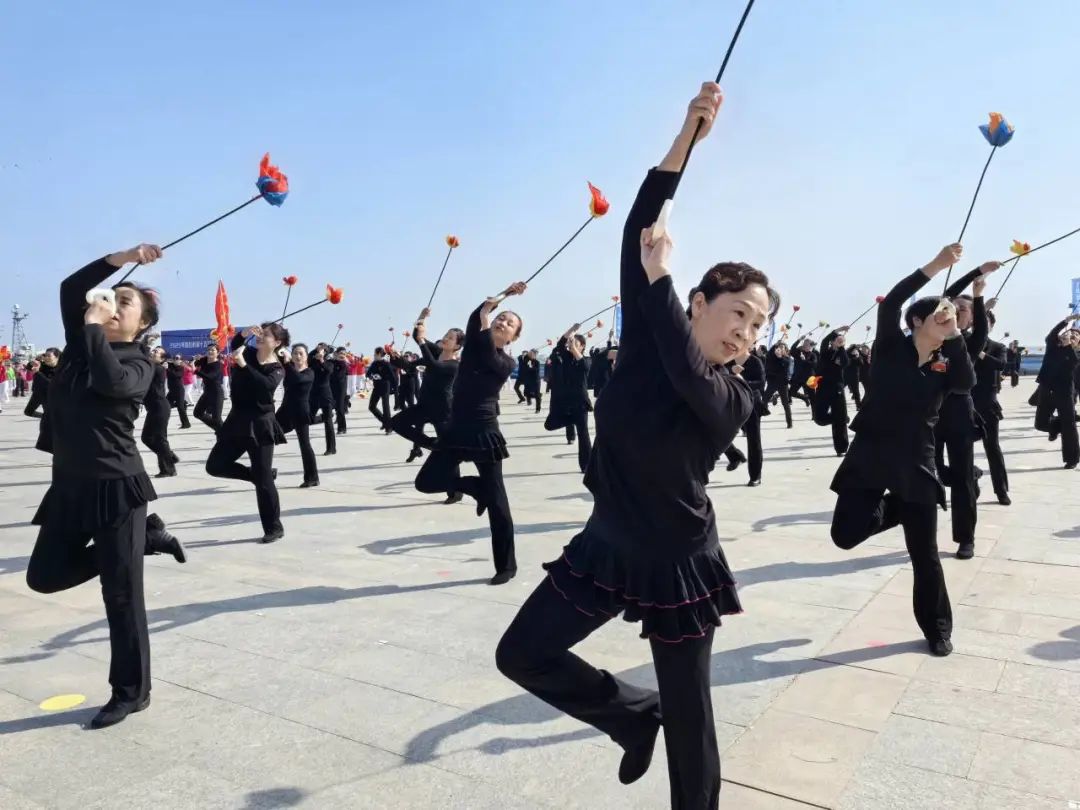 开幕式的展演环节可谓精彩纷呈:威风锣鼓表演作为开场大戏,国家级非物质文化遗产的魅力尽显。表演者们身着鲜艳服饰,精神抖擞,锣鼓声如雷霆万钧,气势磅礴,瞬间点燃现场热情。随后,张灯结彩方队、舒筋拉力操方队、健身球操方队、广播健身操舞方队以及太极拳和健身气功方队依次登场,不同的表演展现出烟台市民对全民健身的热爱,也彰显了这座城市的蓬勃朝气。