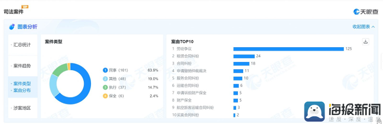 根据天眼查披露的信息,幸福航空所涉案件中,52.52%的案件案由为劳动争议,共有125件。