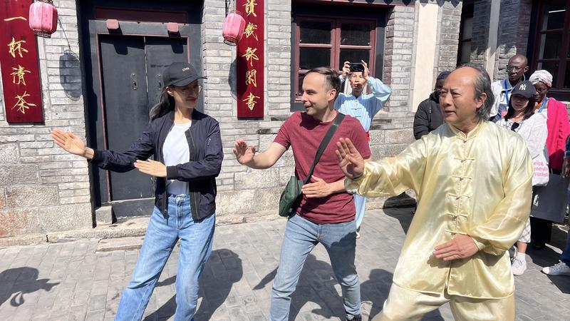 在所城里非遗馆,采访团探访了螳螂拳这一国家级非物质文化遗产。螳螂拳发源于山东莱阳,至今已有300多年历史。其拳法模仿螳螂动作并结合武术攻防技巧,因而得名“螳螂拳”,烟台是至今全国螳螂拳传承和发展最盛行的地区。国家级非物质文化遗产项目螳螂拳代表性传承人、螳螂拳第九代传人于永波为采访团进行了书法和螳螂拳表演,让采访团连连惊叹,有的外籍记者现场就跟于永波学起了螳螂拳。